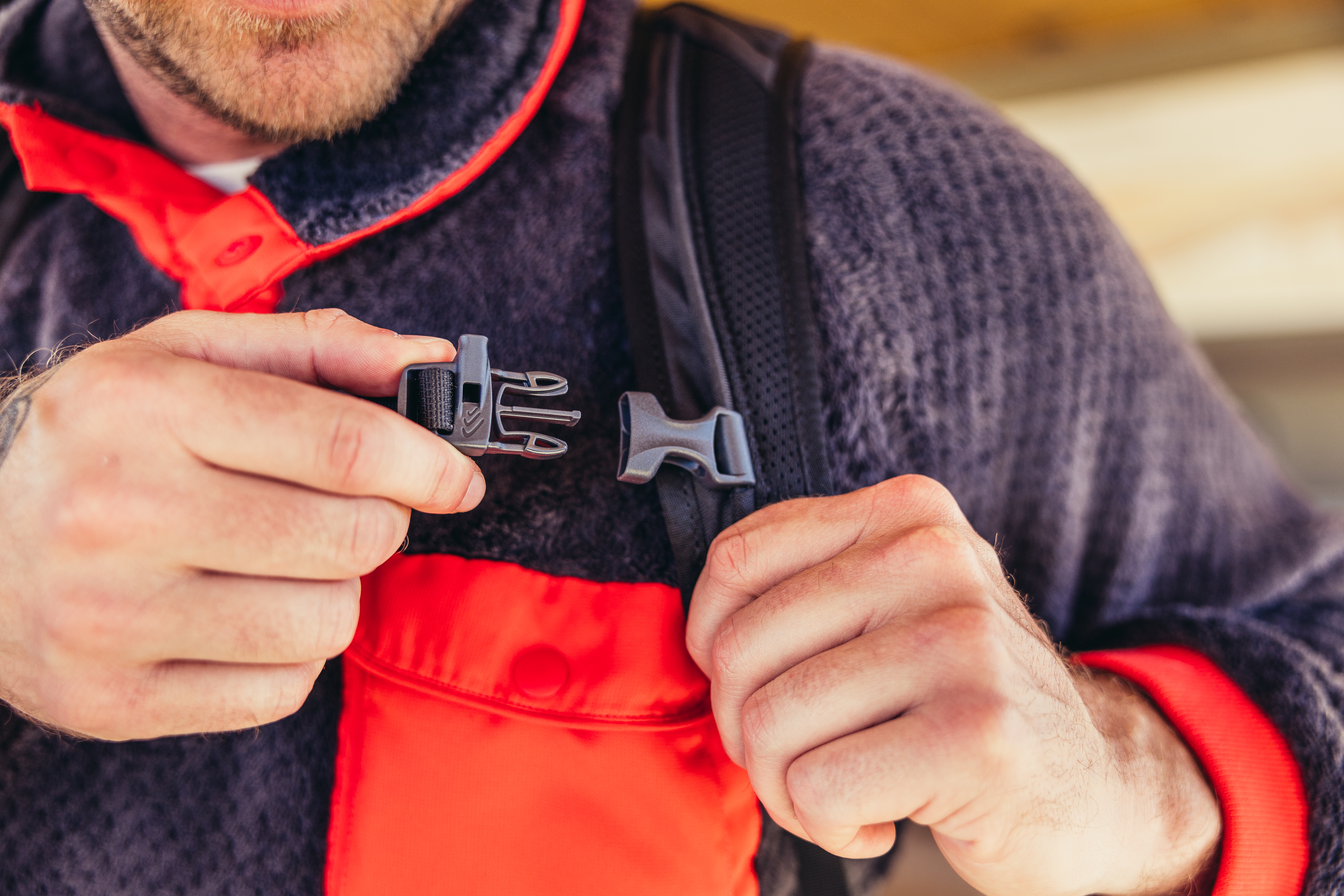 - Padded airmesh shoulder harnesses with one-handed sternum strap buckle and hydration routing loops